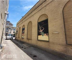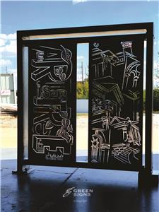 This custom Mesh Panel System is the first of it's kind here at Green Signs Co. These artistic panels are made with perforated aluminum and are powder-coated to ensure that they last. Working with a local artist helped to add a creative touch to this historical area. Customers can upgrade to the GSC 600 series to add internal premium UL RBG LEDs to bring out the unique designs so they can be enjoyed during darker hours.