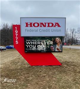 Honda Federal Credit Union got a brand new look for its Main ID Sign. Now, it's hard to miss. With a double-sided internally lit aluminum cabinet sign and a double-sided Electronic Message Center, Honda FCU can be seen and be heard. Their new EMC (Electronic Message Center), will help them communicate with their clients and customers in real-time over broadband wireless internet. #Electronic #MessageCenter #OhioSigns #DigitalSigns #OutdoorProgrammableSigns