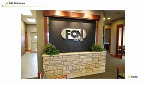 At the FCN location in Connersville, IN was a complete sign package. Green Sign Company made custom internally illuminated cabinets with an embossed pan logo, accompanied by an electronic message center on the exterior. For the interior/exterior wall logos, we used brushed aluminum that is illuminated with accent lighting.