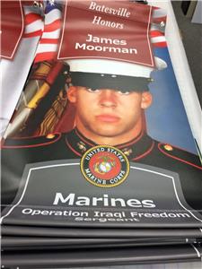 Here at Green Sign Company, we were pleased to help the town of Batesville, Indiana honor their current and former service men and women with customized GSC 110 Series banners. These changeable, flag-mounted banners with decorative brackets were proudly displayed throughout town, each displaying the name and picture of an individual, along with the branch in which they served our country.