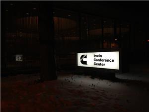 At the FCN location in Connersville, IN was a complete sign package. Green Sign Company made custom internally illuminated cabinets with an embossed pan logo, accompanied by an electronic message center on the exterior. For the interior/exterior wall logos, we used brushed aluminum that is illuminated with accent lighting.