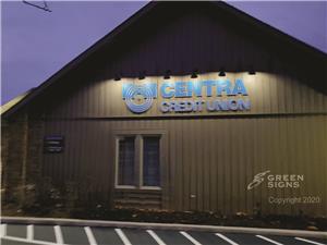 This GSC 300/775 Series thick PVC dimensional lettering with Goose-Neck Lighting adds a simple but attentive style to this Centra Credit Union in Nashville IN.