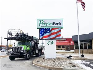 The Peoples Bank updated signage at their Seymour locations consists current branding design as well as a double sided electronic message center that allows important information such as rates on loans & savings accounts as well as the many financial services they provide to remain competitive in the market with current and potential clients. The high visibility with LED lighting inside the cabinet will draw attention to the EMC communication.