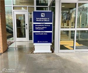 Another recently completed project for Decatur County Memorial Hosptial's new Rehab Office! Since we've worked with DCMH on many different projects in the past, our main task for this project was to maintain the branding that has already been established! Using the information that we already had and new information for the new building, our design team put together custom design layouts for DCMH to review. Once they approved a design, our production team began building the new sign. This sign is part of our GSC 450 Series - Custom Main ID Directory Sign. After the sign was complete, our install team took the sign to site and installed it!