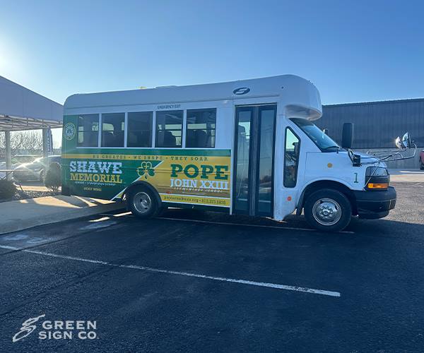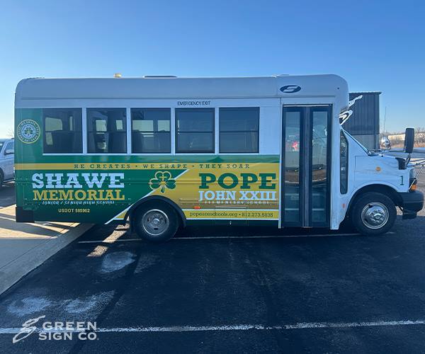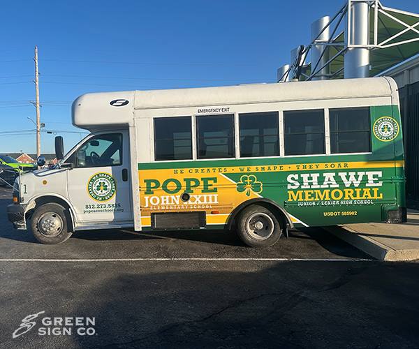 Green Signs recently partnered with Shawe Memorial Schools in Madison, Indiana to design, create, and install a custom GSC 100 Series bus wrap that transforms their school bus into a bold, mobile branding statement. From Concept to Completion Our team worked closely with school leadership to develop a design that captures the pride, tradition, and spirit of Shawe Memorial Schools. From the initial design phase through production and professional installation, every step of this project was handled in-house to ensure quality, consistency, and long-term durability. The GSC 100 Series wrap delivers: High-impact, full-color graphics Durable materials built to withstand daily routes and changing weather Professional installation for a seamless, long-lasting finish Enhanced visibility throughout Madison, IN and surrounding communities Turning a School Bus into a Mobile Billboard A custom school bus wrap does more than update the look of a vehicle — it extends a school’s brand beyond campus. Every route, field trip, and event becomes an opportunity to showcase school pride and strengthen community recognition. For schools looking to elevate their branding, increase visibility, and create a cohesive identity across facilities and vehicles, custom bus wraps are a powerful solution. We’re proud to support Shawe Memorial Schools and grateful for the opportunity to bring their vision to life.