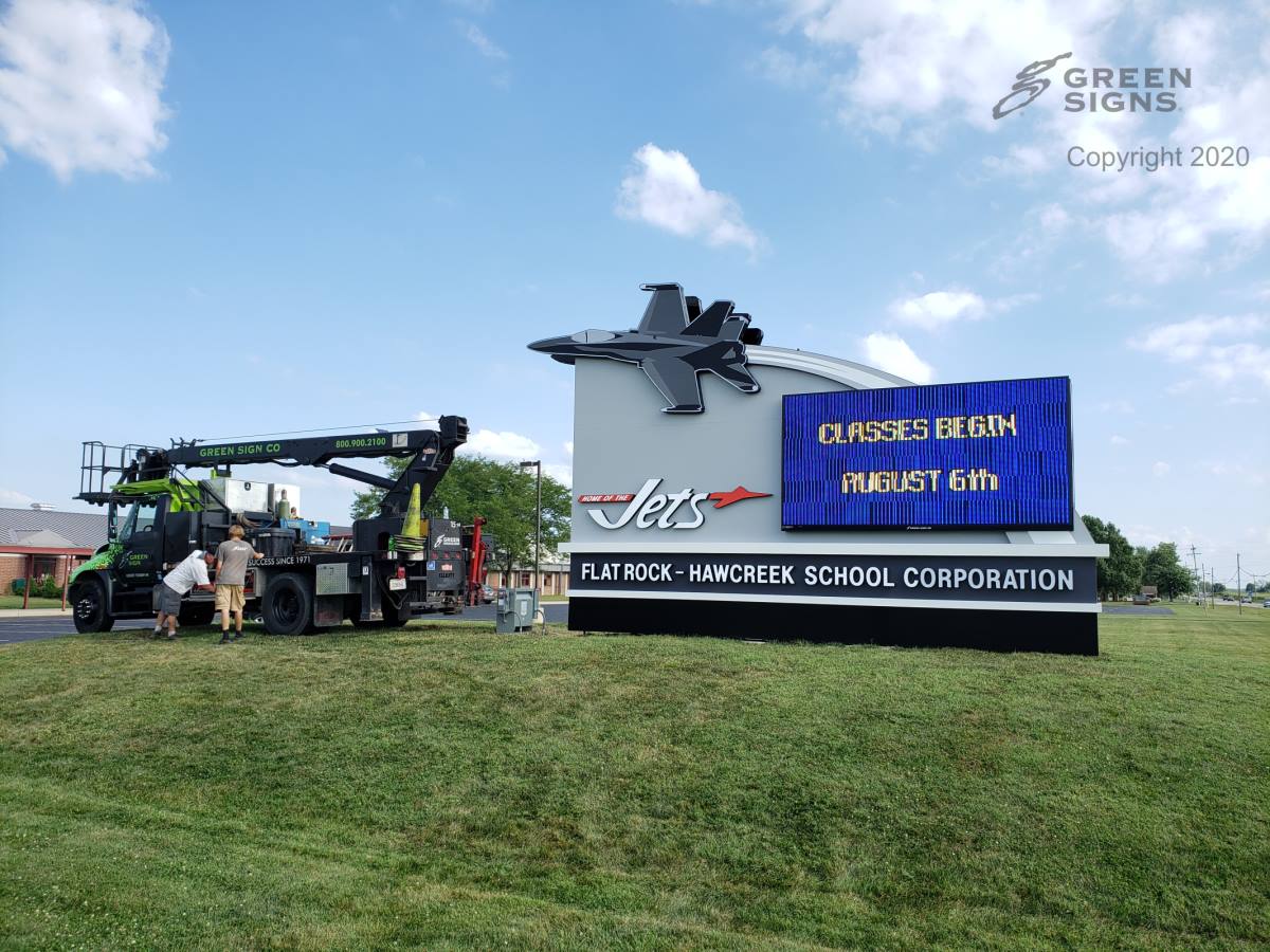 Flatrock-Hawcreek School Corporation in Hope IN was due for a new sign introducing all their schools as one and what better design team to do the job than us here at Green Signs. This sign was huge in size as well as in our creative design. With the high resolution Electronic Message Center and custom dimensional letters/Jet logo this sign definitely is a eye catcher and a great gateway for the schools.