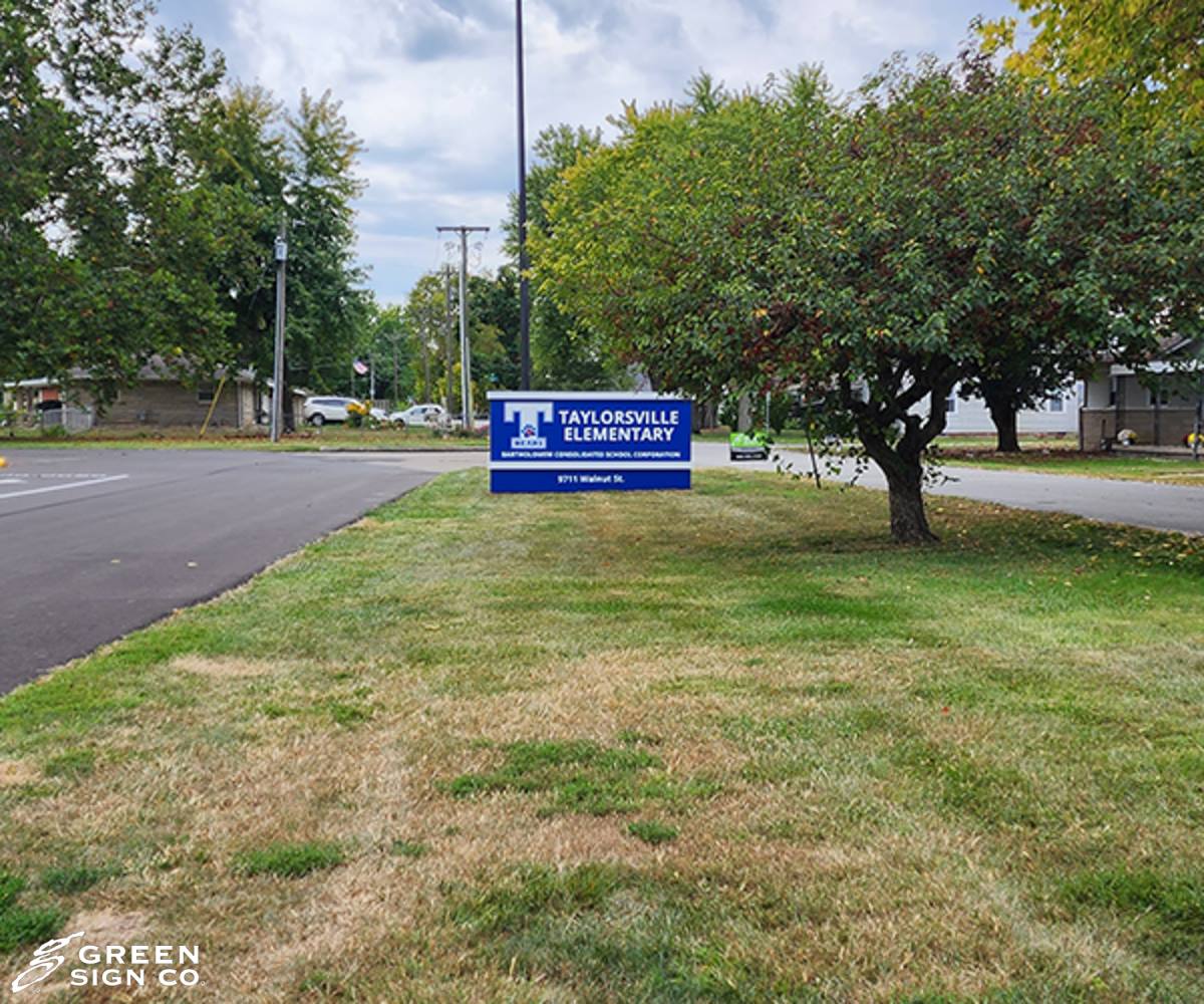 Up next on our BCSC School Sign update, BCSC Taylorsville Elementary School!! As mentioned in our other BCSC school posts, our #1 task with these projects was to maintain consistency throughout the school district while making the signs unique to each school! This was achieved by using the school's colors and mascot at each location!